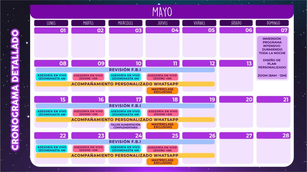 Es un programa INTENSIVO online donde te acompañaré personalmente por 1 mes para ayudar a que tu bebé duerma mejor en el día y la noche, y lo haremos de la siguiente manera: