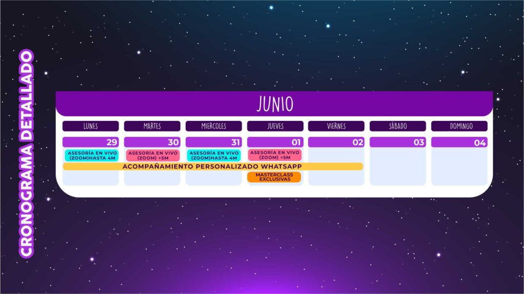 Sesión de asesoría EN VIVO de Lunes a Jueves durante 4 semanas. Tendrás acceso a una SALA DE ZOOM PERMANENTE de 08:30am a 10:00am entre el 08 de Mayo y el 01 de Junio de 2023 para que entres y me preguntes lo que quieras.